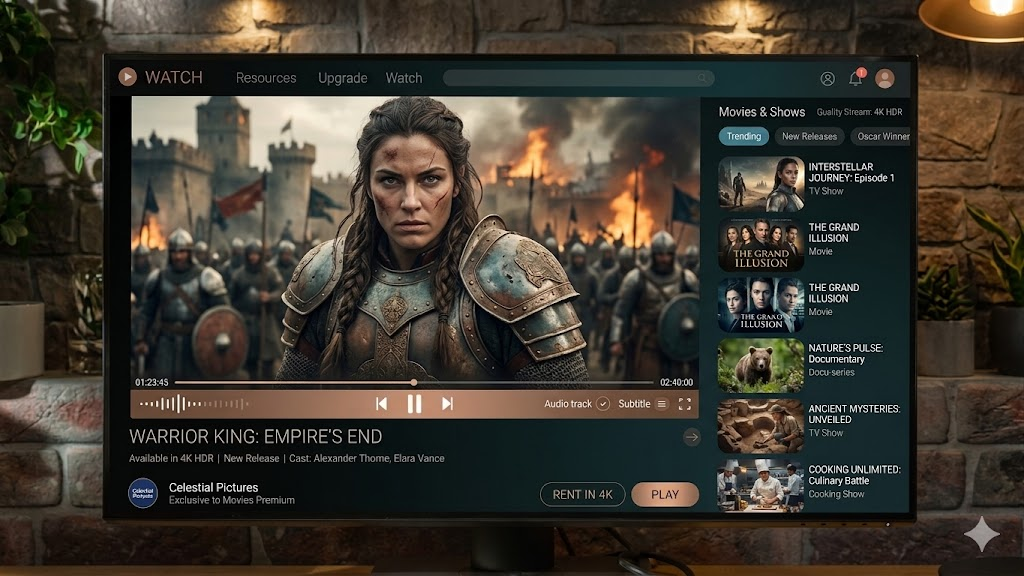 A curated on-demand catalog of feature films, TV series and documentaries. Our editorial team selects titles across genres — from drama and thriller to comedy and family — and adds new content regularly. All video content is available for streaming in HD, with 4K available on supported devices and connections.